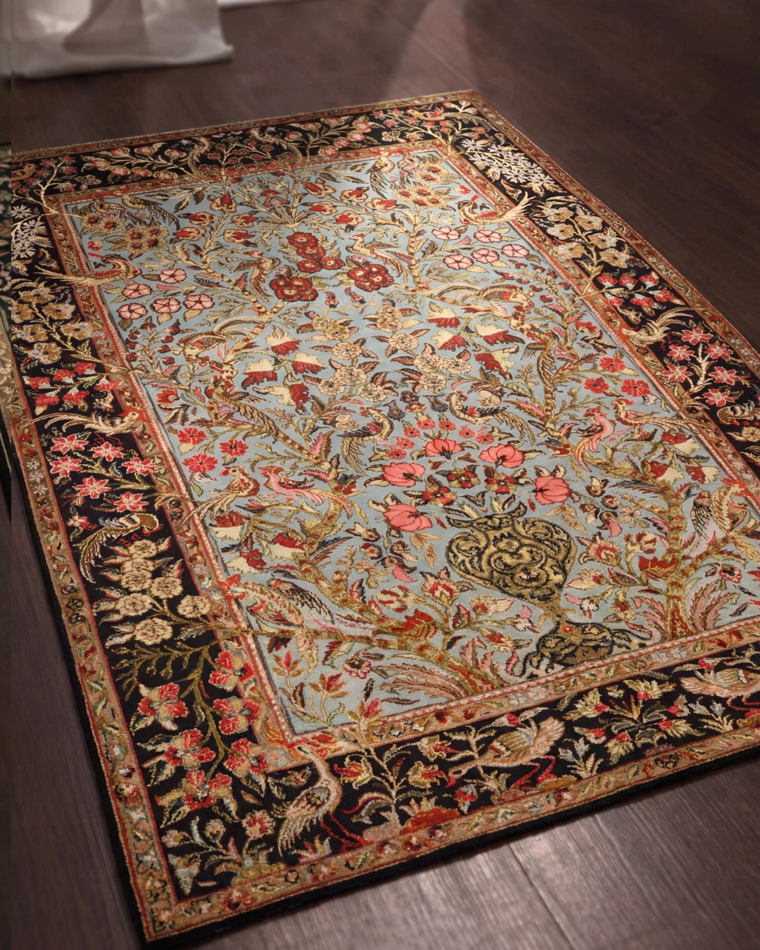 -Bring home the serenity of a royal garden with The Golden Meadow Rug — a tapestry of blooms, birds, and timeless grace, woven in the spirit of India's most opulent courts. Crafted in a luxury chenille blend with a soft, velvety handfeel. Lush floral and avian motifs set against a dreamy powder blue, evoking eternal spring. Rich accents of crimson, gold, and ivory dancing across every inch of the weave. A palette of soft blues, deep maroons, and warm golds for enduring elegance. Intricate border detailing inspired by classical Mughal garden tapestries. Expansive design that fills your space with quiet, blooming grandeur. Anti-skid backing ensures secure placement, preserving its graceful presence