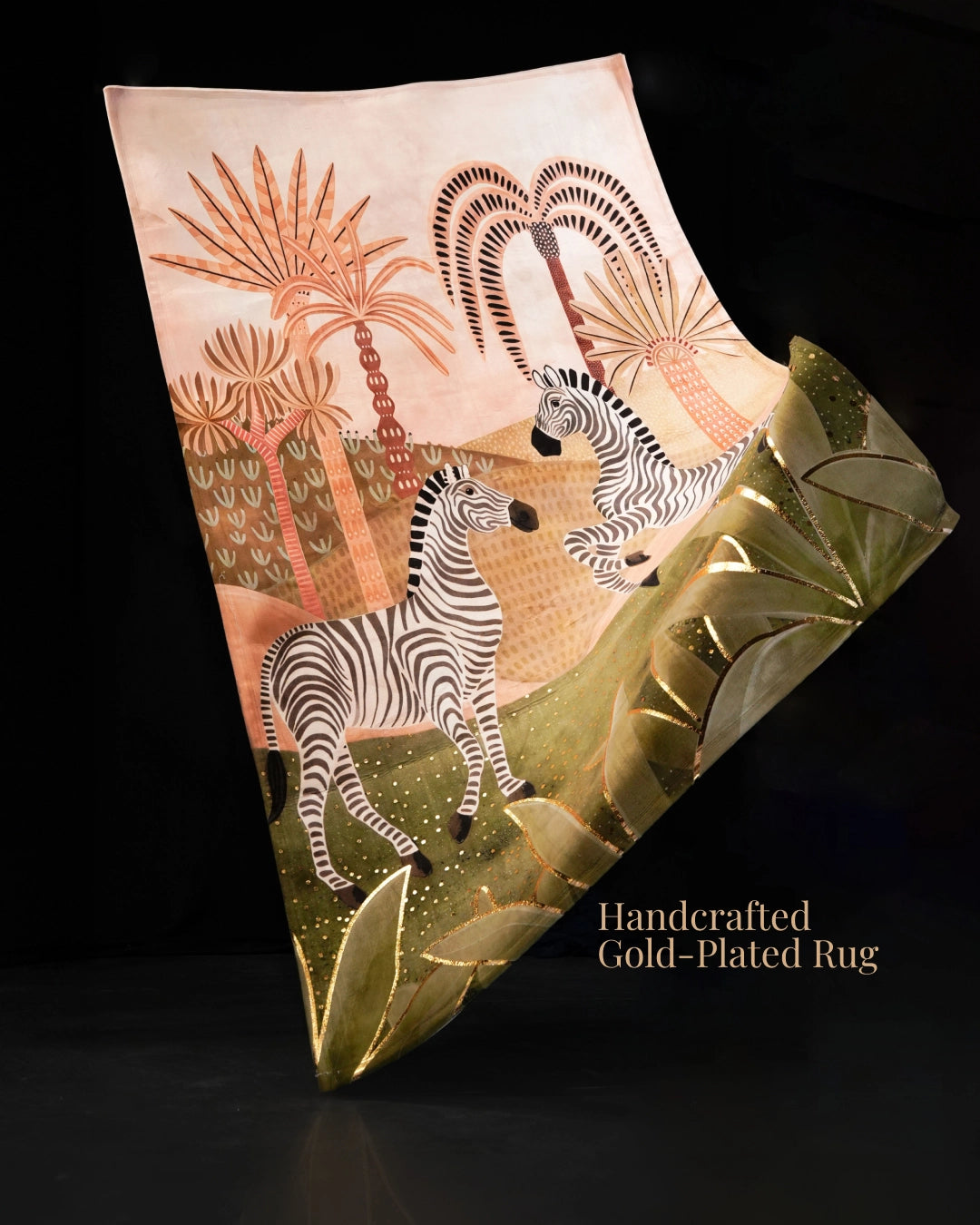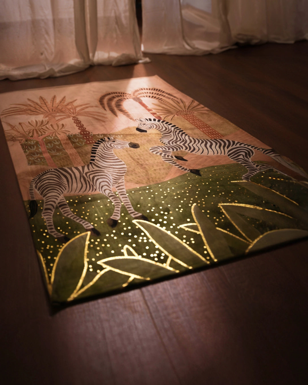 -Step into wild elegance with The Savannah Bloom Rug — zebras poised amidst golden palms and soft blush tones, captured in woven artistry.