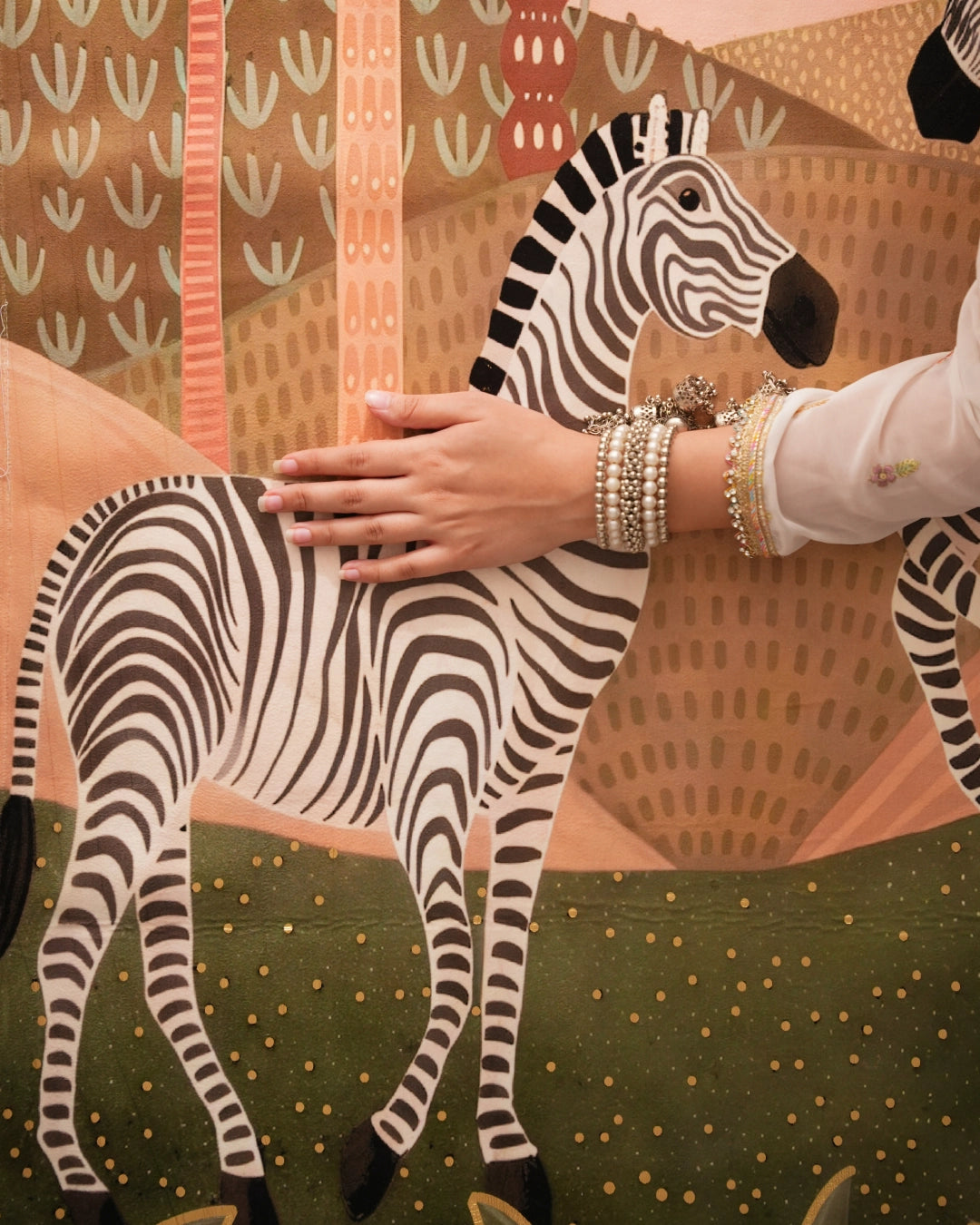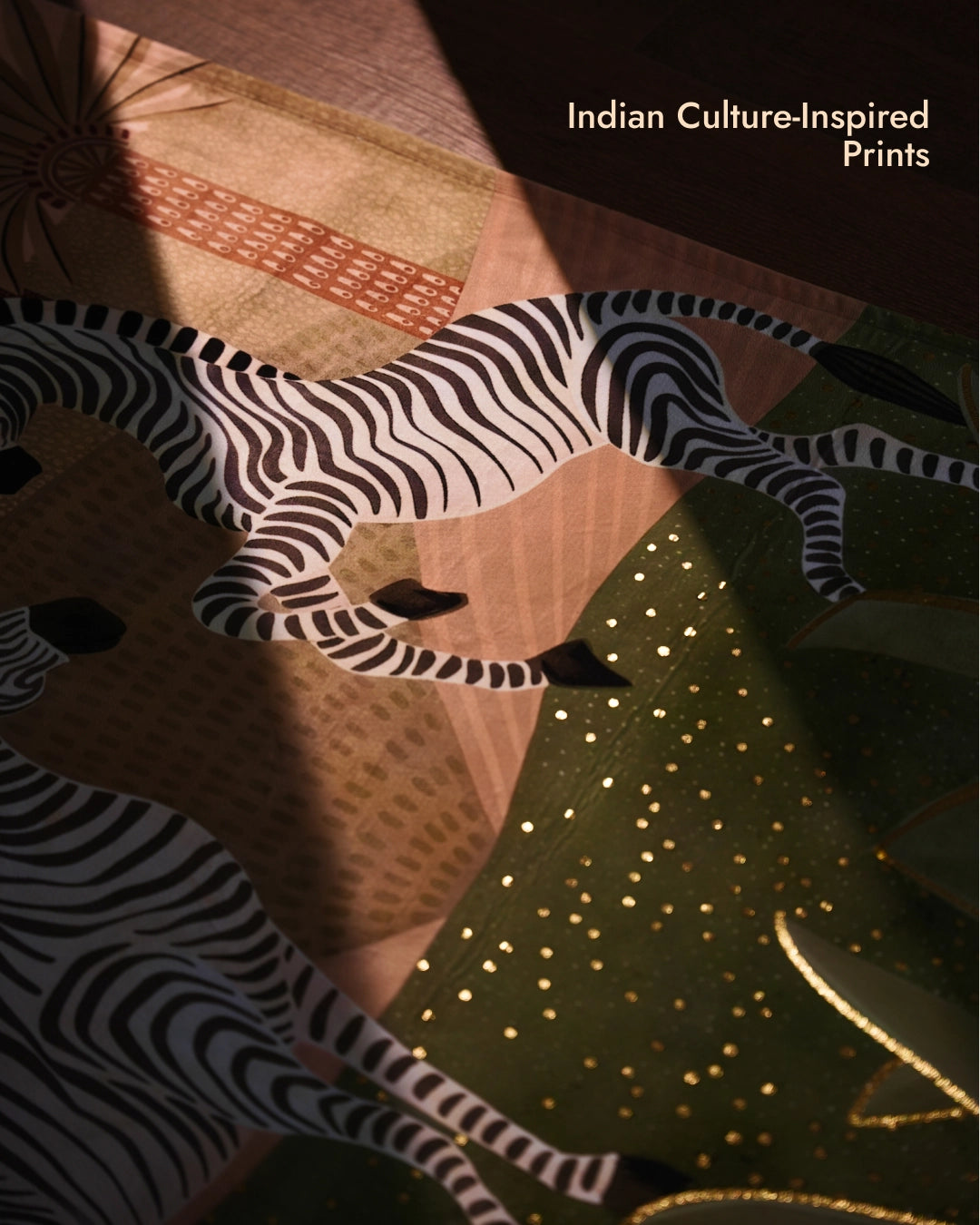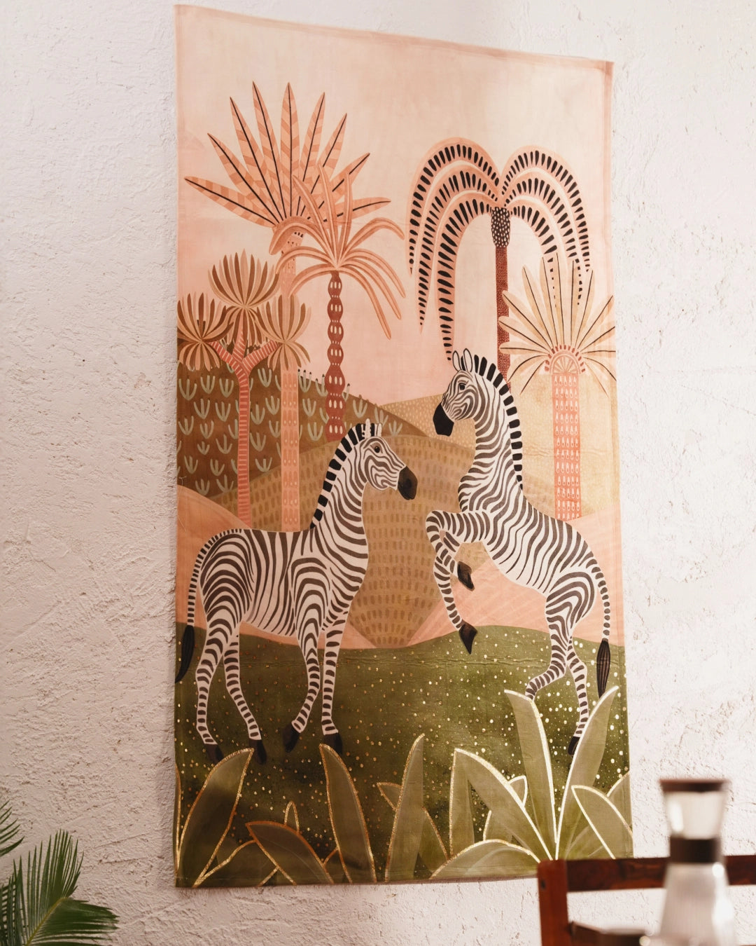 Playful zebra motif framed by lush palms and golden accents, balancing whimsy with sophistication