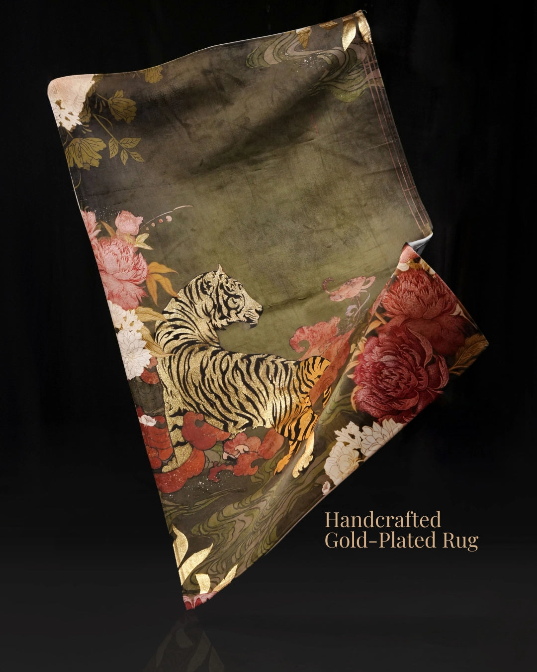 -Bring home the aura of royalty with The Bengal Empress Rug — a golden tiger resting amidst lush blooms, woven in timeless elegance.
