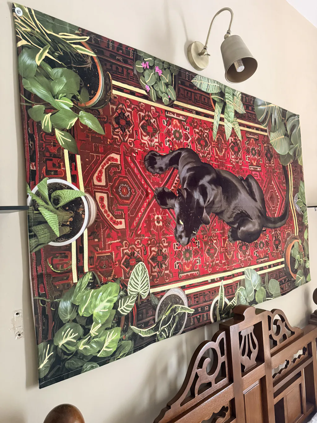 -Unveil bold elegance with The Black Panther Rug — a sleek black panther set against a crimson Persian ground, framed by lush foliage and golden accents.