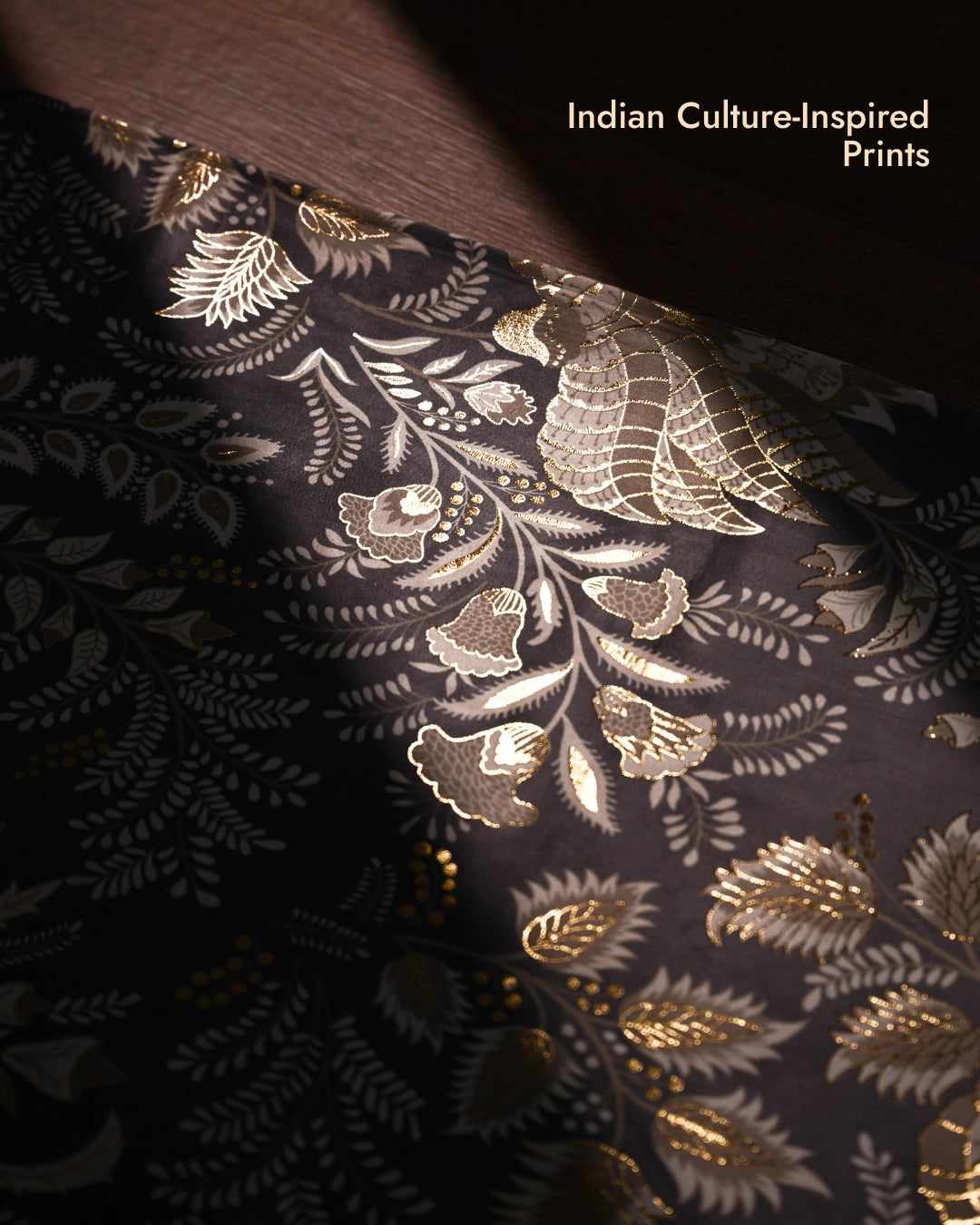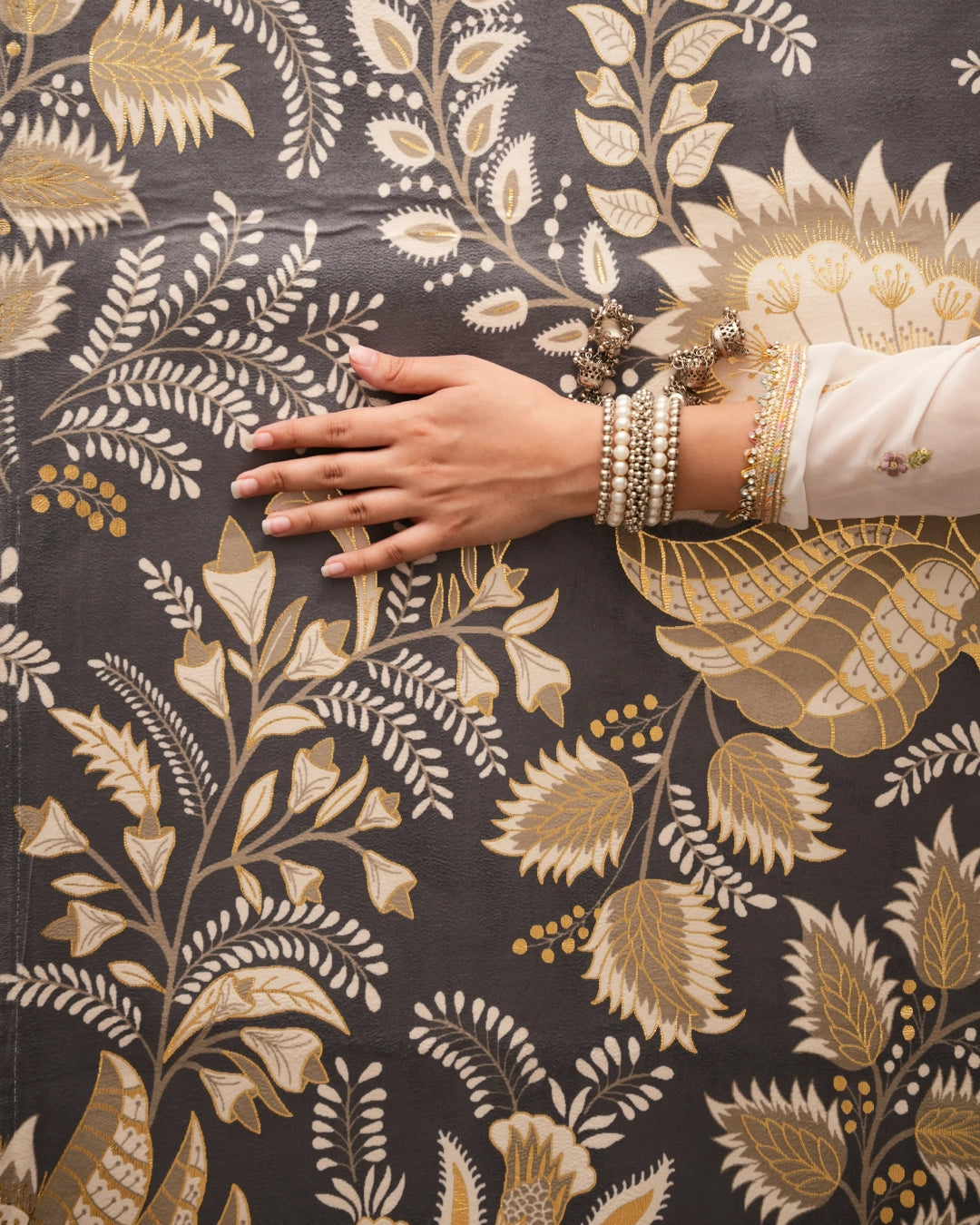 Gold thread detailing woven across the design for a radiant, elevated finish