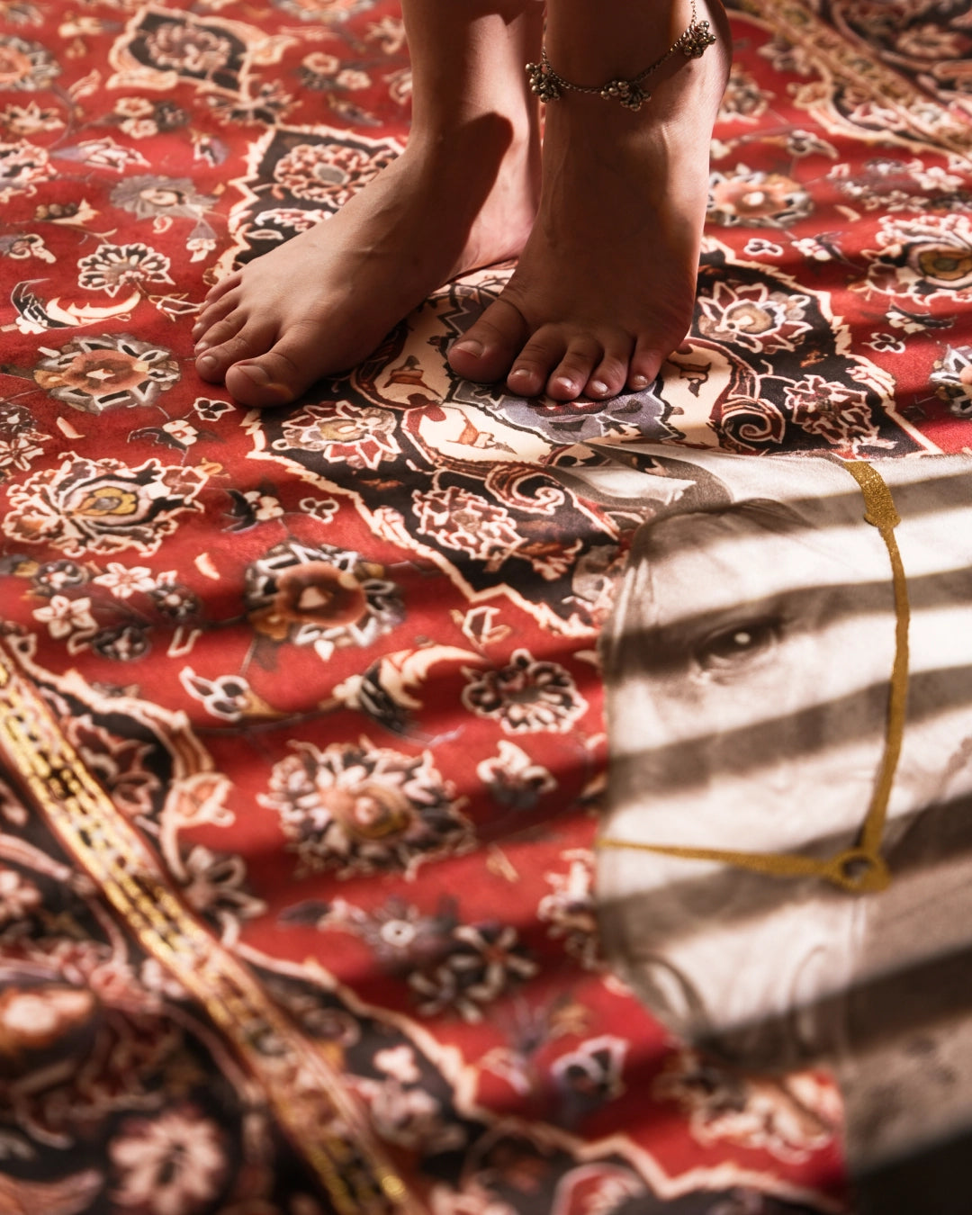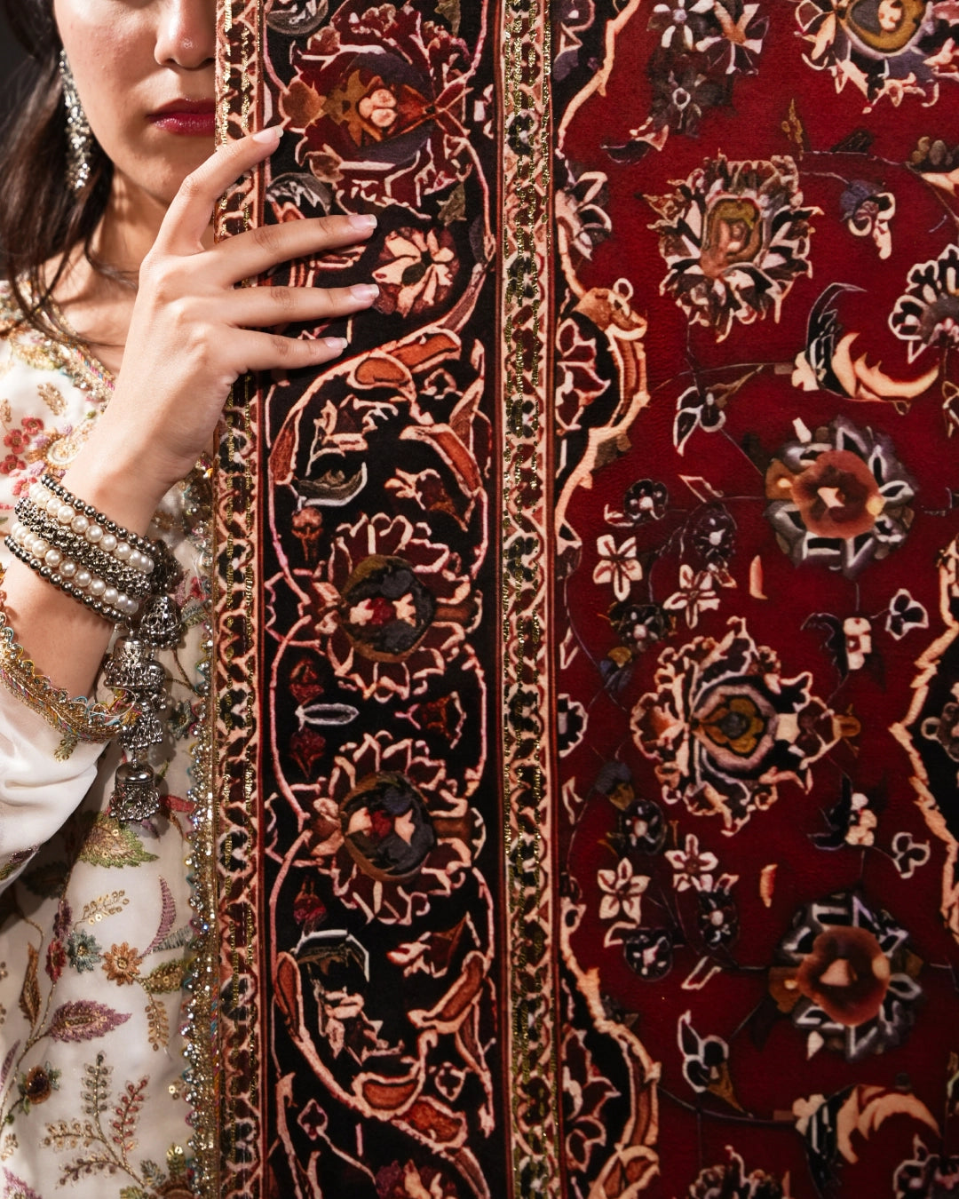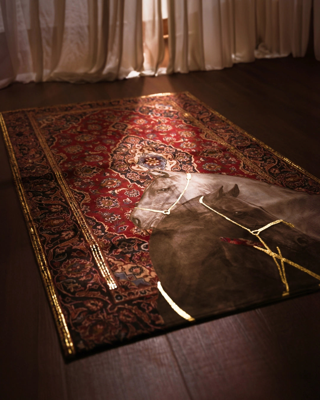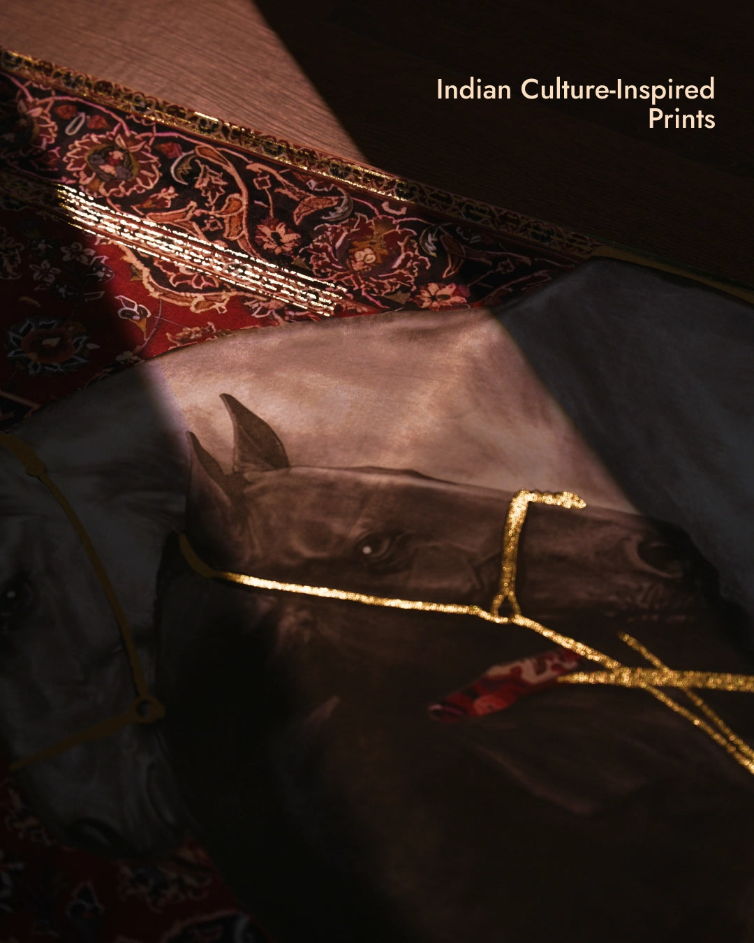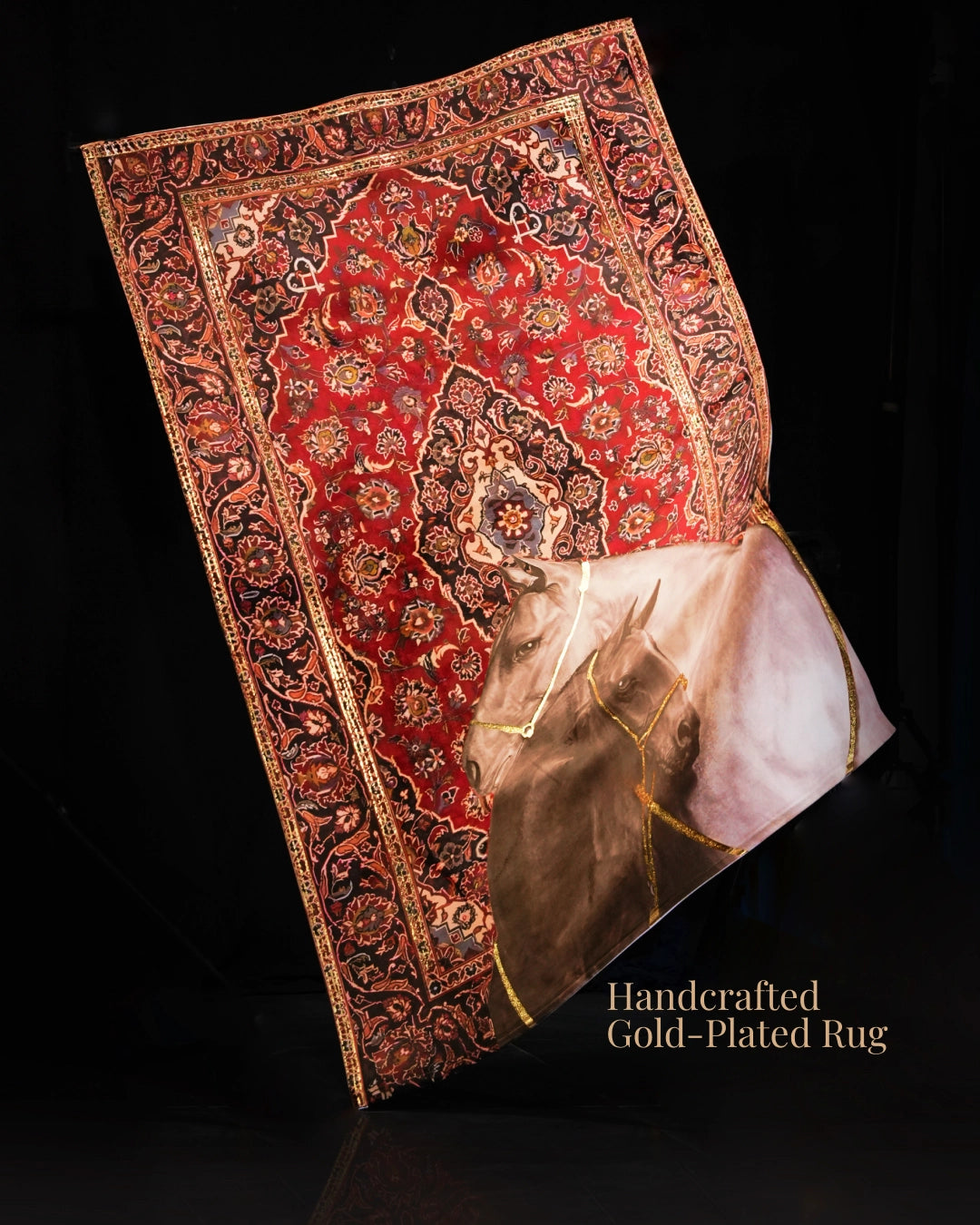 Gold thread accents highlighting bridles and borders with subtle radiance